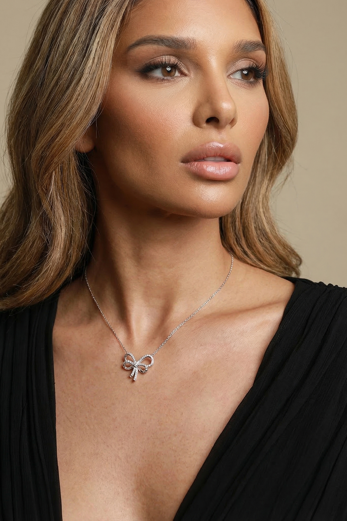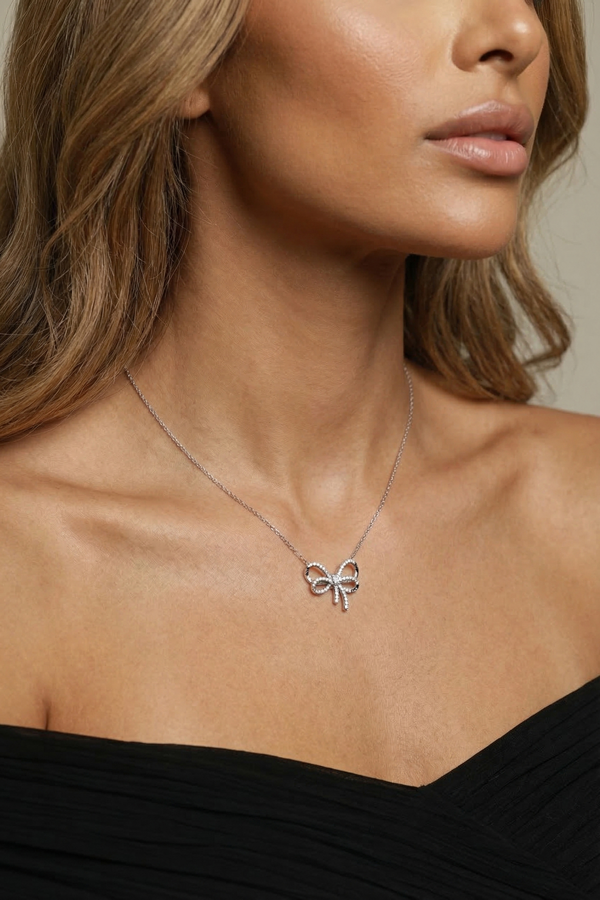 Lant din argint Manissi Zirconia Bow placat cu rodiu, placare subtire standard de 0.6 microni. Lantul este la baza gatului cu pandantiv de 2 cm sub forma de fundita. Lantul are lungimea de 38 cm cu prelungire de 5.5 cm.