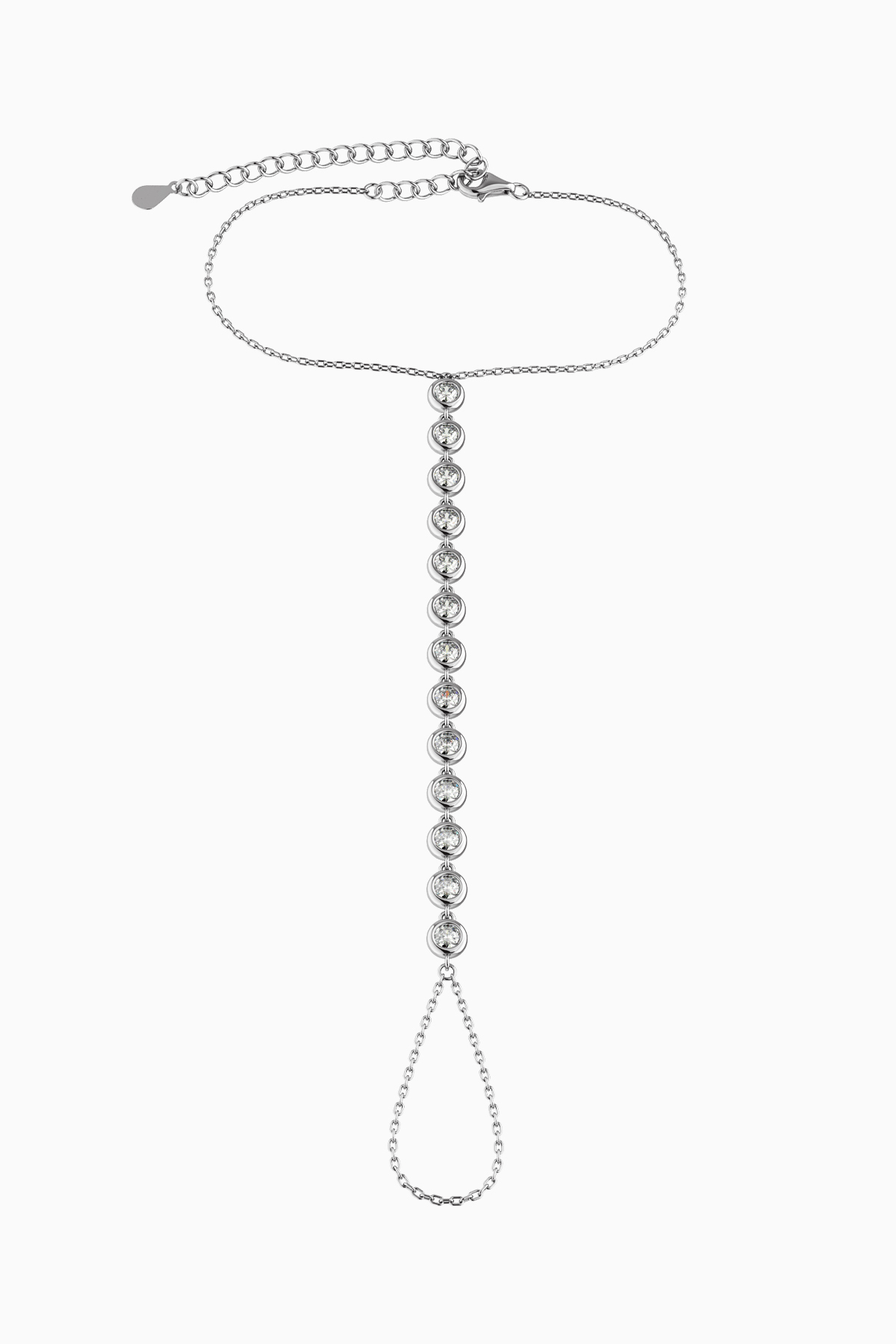 Pietrele sunt Moissanite de 3 mm, 0.1 carate fiecare piatra, culoare D, claritate VVS1, taietura excelenta. Bratara are lungimea de 24 cm, lantul care se pune pe incheietura are lungimea de 15 cm + 5 cm. Lungimea lantului cu pietre este de 8.5 cm.
