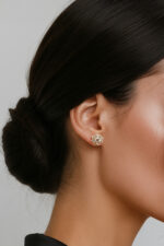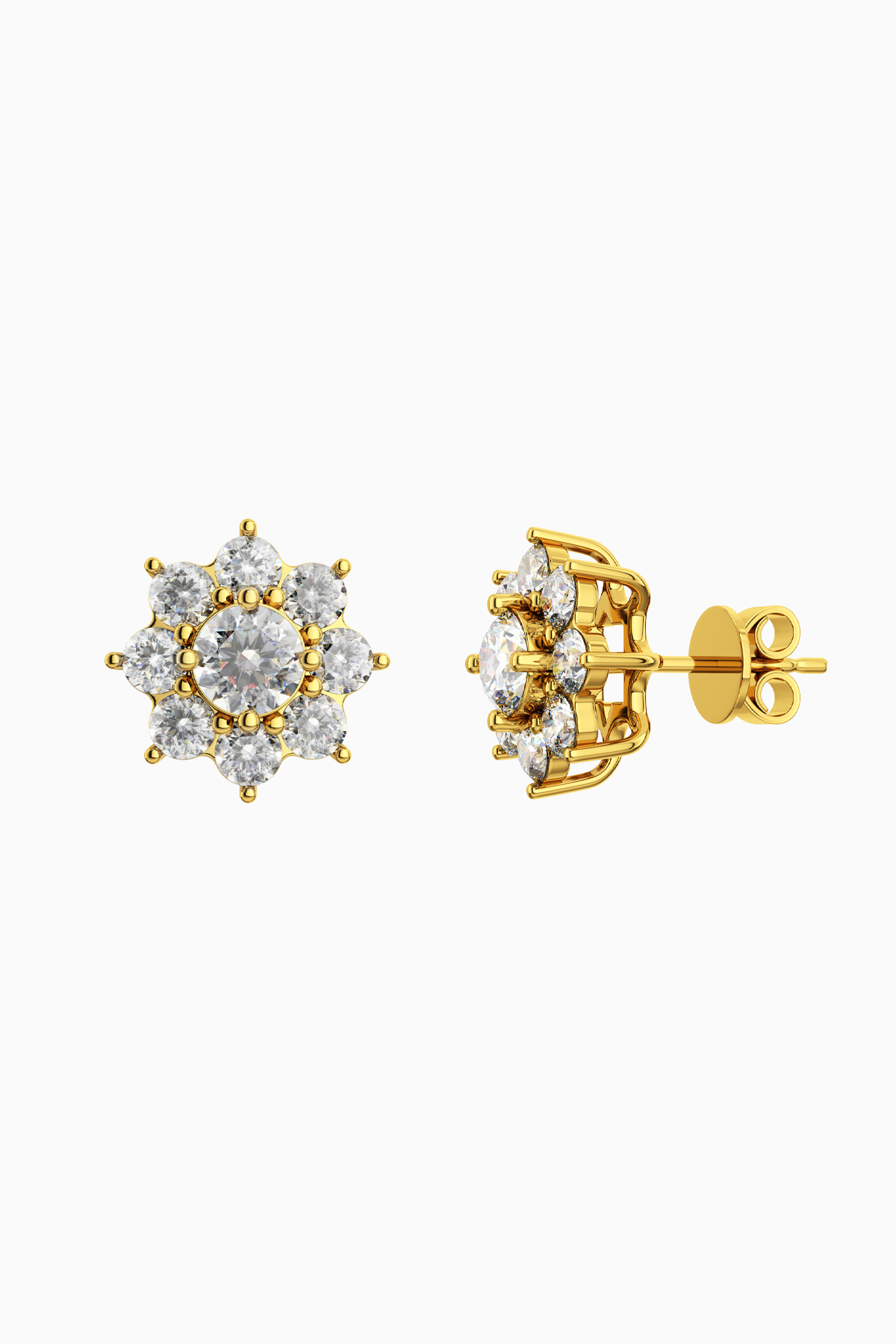 Cercei din argint Manissi Diamond Bloom Gold placati cu aur galben de 18K, placare standard de 0.6 microni. Toate pietrele sunt Moissanite iar piatra principala are 5.5 mm, 0.6 carate, culoare D, claritate VVS1, taietura excelenta rotunda. Cerceii au diametrul total de 1.2 cm.