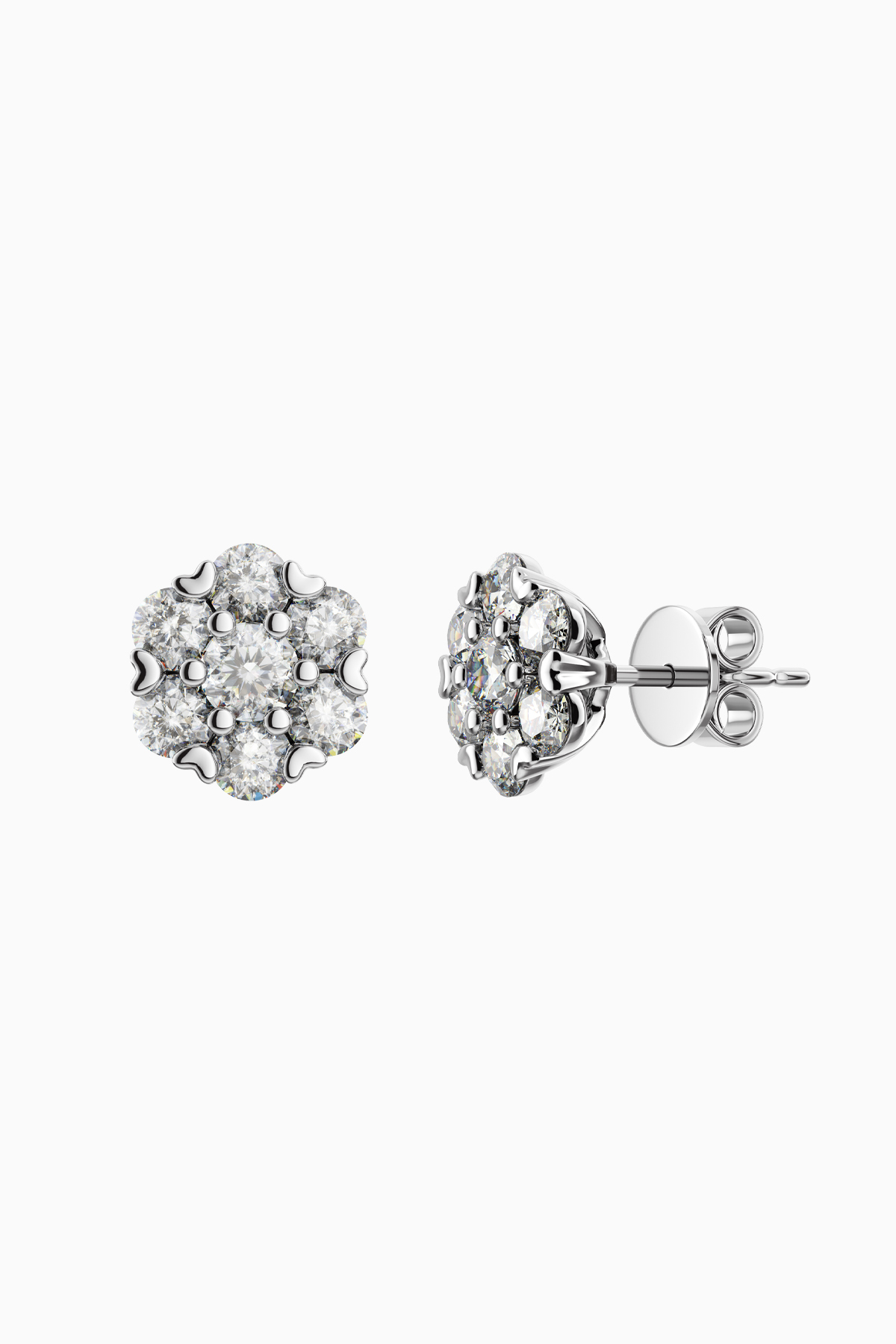 Cercei din argint Manissi Diamond Estella 3 mm placati cu aur alb de 18K, placare standard de 0.6 microni. Piatra este diamant moissanite de 3 mm, 0.1  carate per cercel, culoare D, claritate VVS1, taietura excelenta rotunda. Cerceii au diametrul floarei de 9 mm.