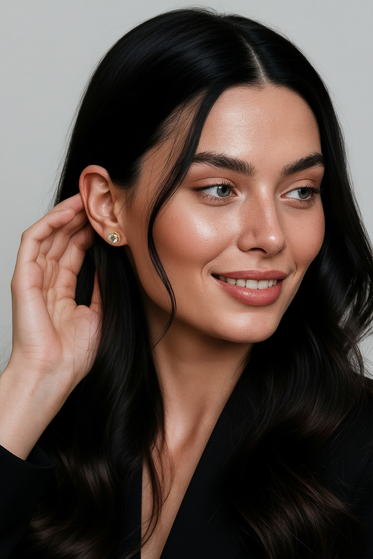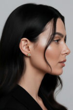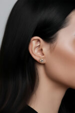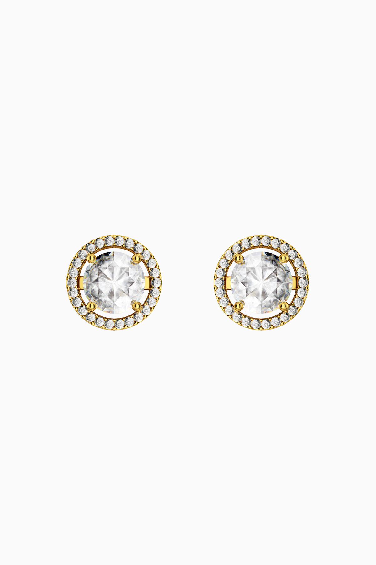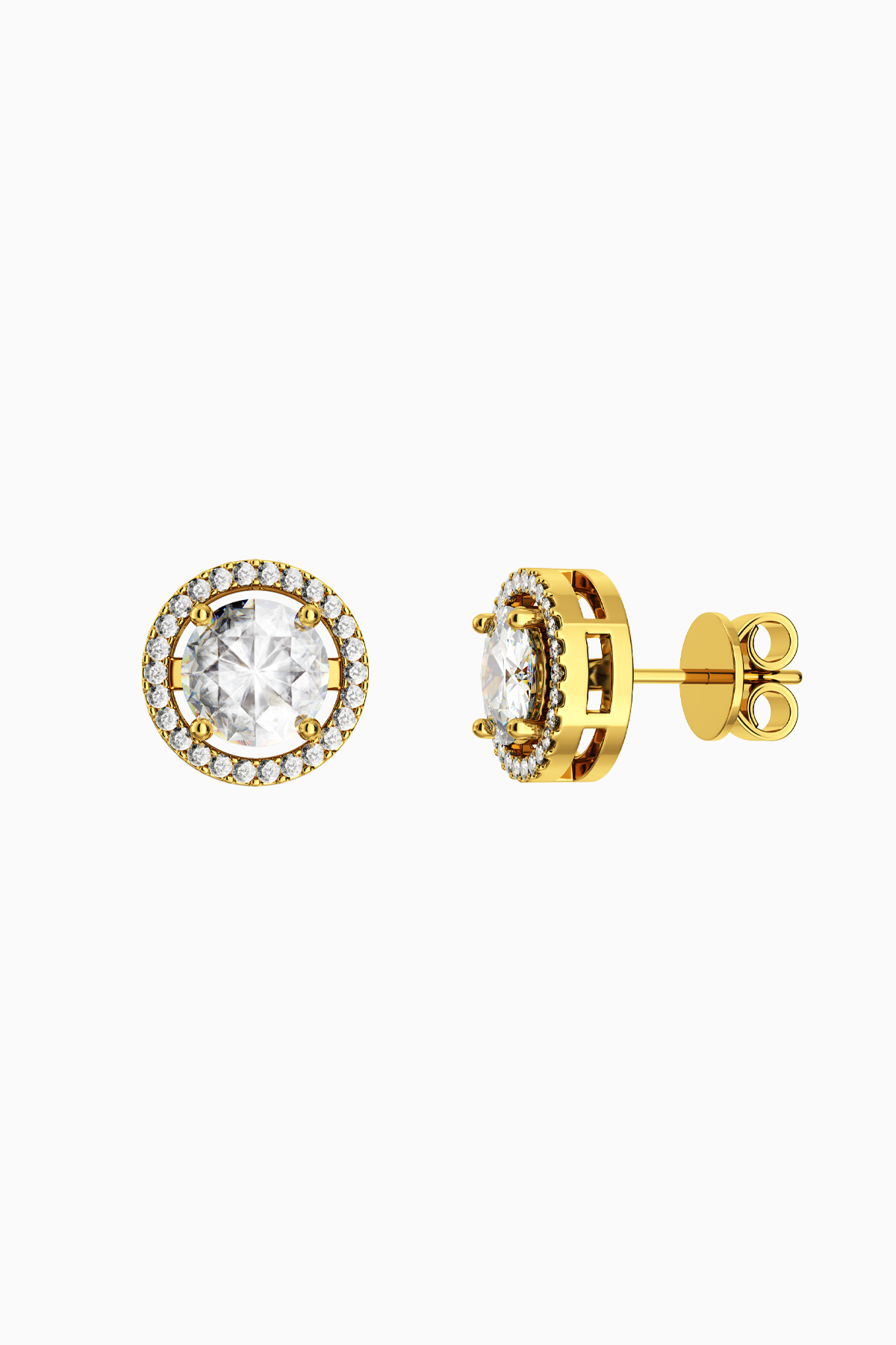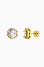 Cercei din argint Manissi Halo 6.5 mm Gold placati cu aur galben de 18K, placare standard de 0.6 microni. Piatra principala este diamant moissanite de 6.5 mm, 1 carat, culoare D, claritate VVS1, taietura excelenta rotunda, iar pietrele mici sunt si ele tot pietre Moissanite. Cerceii au diametrul total de 1 cm.