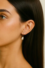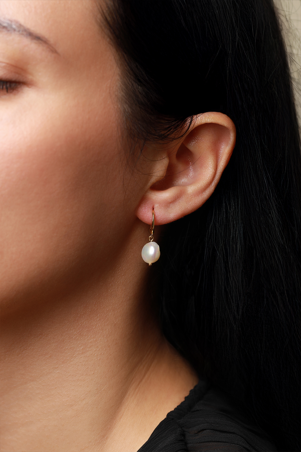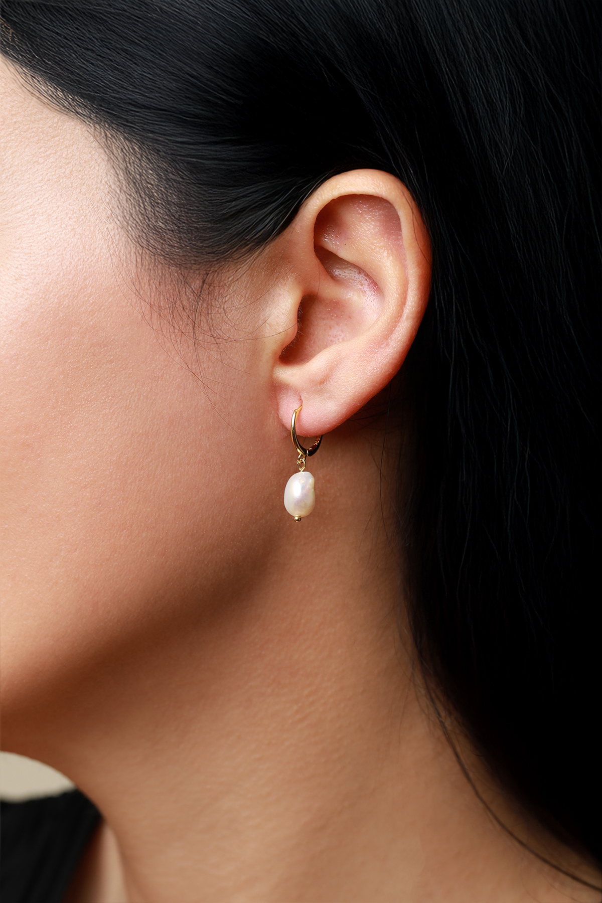 Cercei din argint Manissi Huggies Baroque Drop Gold placati cu aur galben de 18K, placare standard de 0.6 microni. Perla este naturala de cultura de apa dulce. Diametrul exterior al cercelului  este de 1,1 cm.