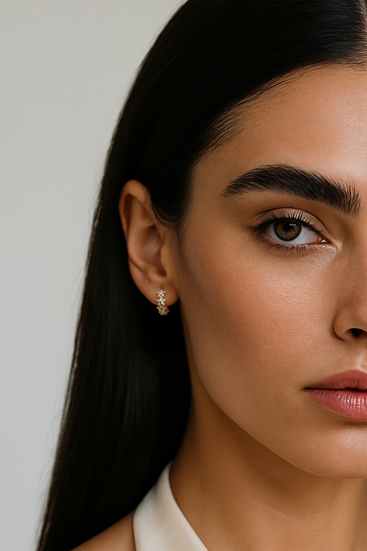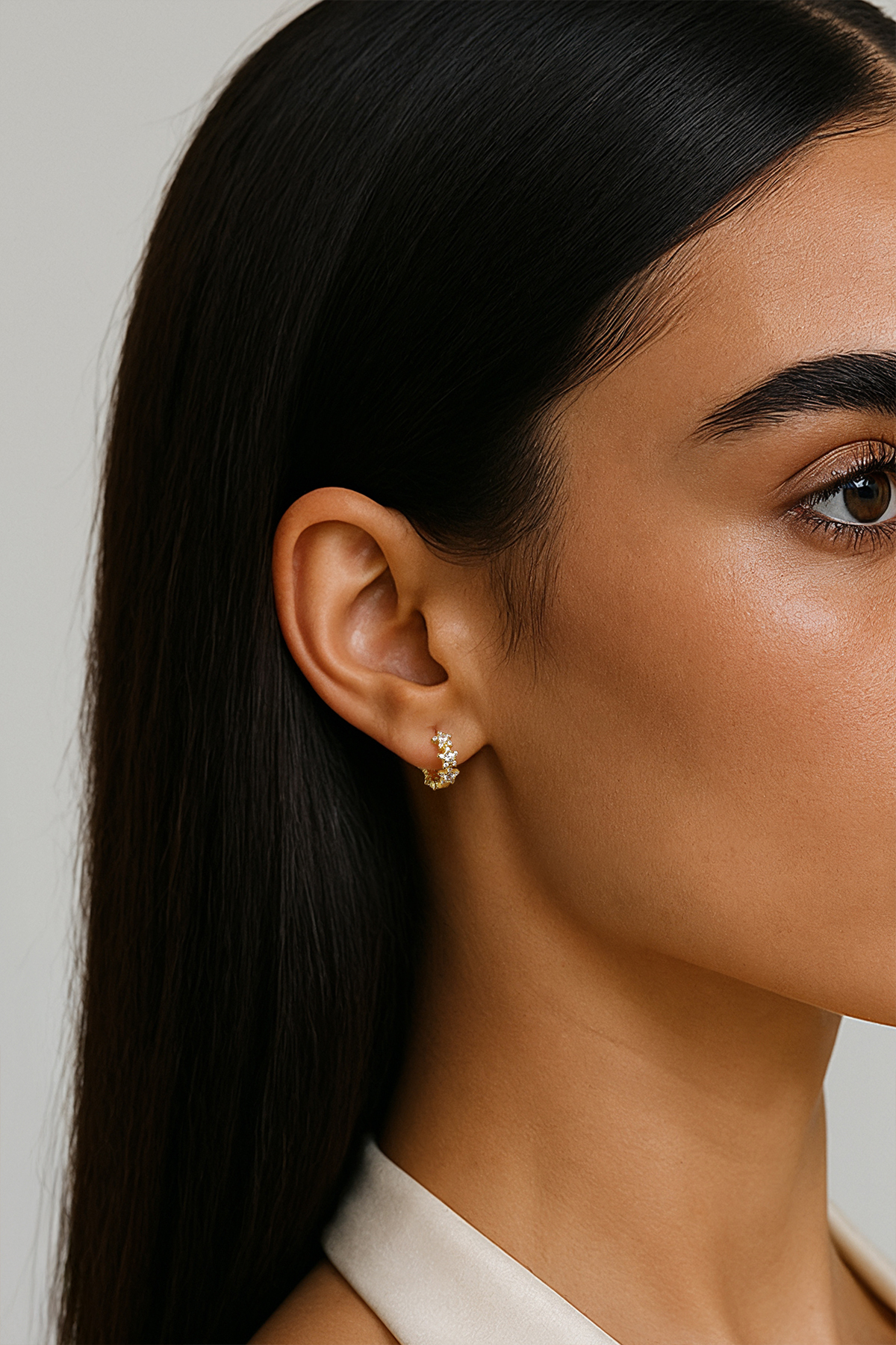 Cercei din argint Manissi Three Stars Gold placati cu aur galben de 18K, placare standard de 0.6 microni. Diametrul intern este de 9 mm si inchiderea se face cu tortita. Cerceii sunt prevazuti cu pietre zirconiu transparente.