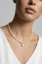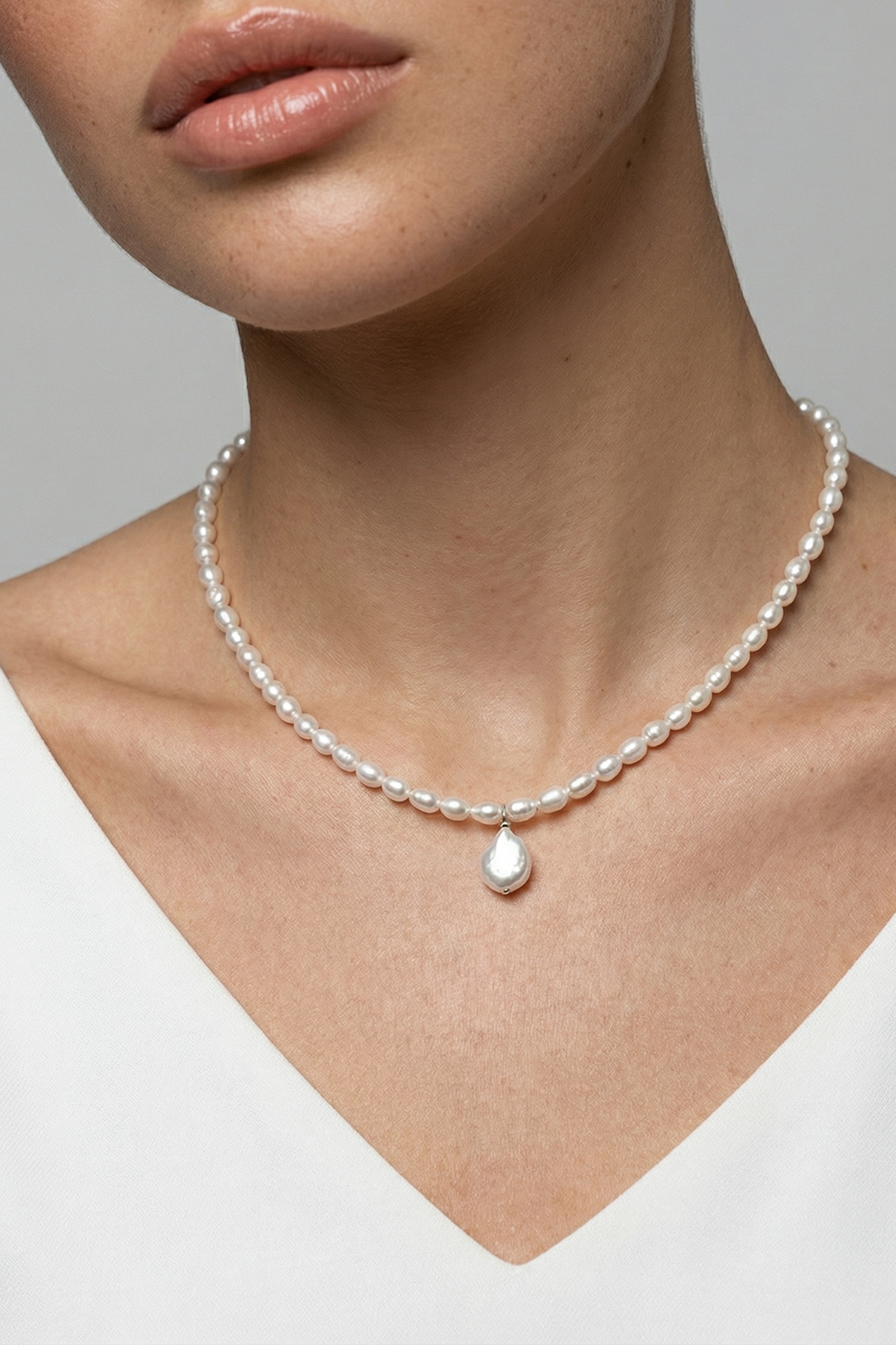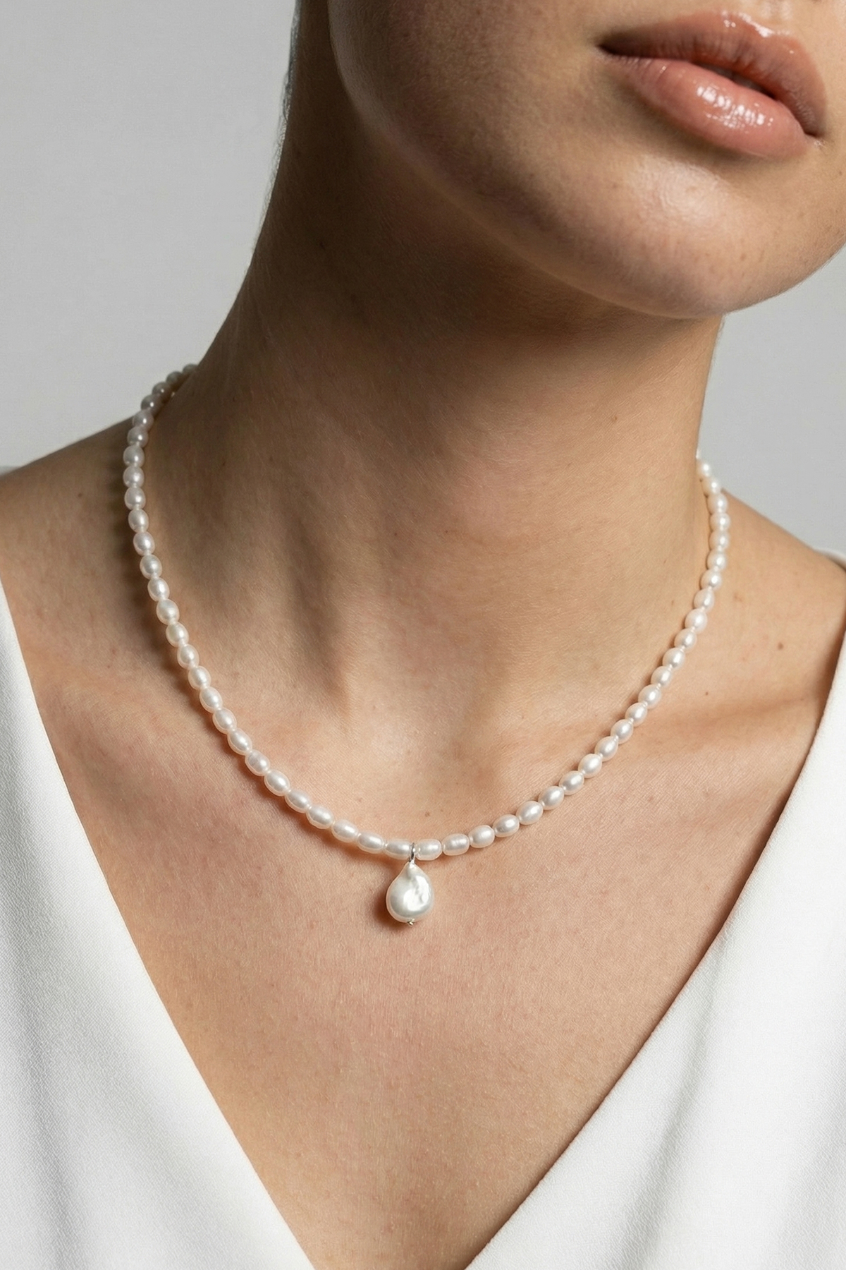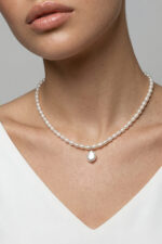 Marimea perlelor este de 5-6 mm, forma este bob de orez, iar pandantivul are inaltimea de 1.2 cm. Perlele sunt diferite intre ele, fiind naturale de cultura, iar forma pandantivului este diferita de la un colier la altul.