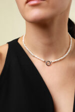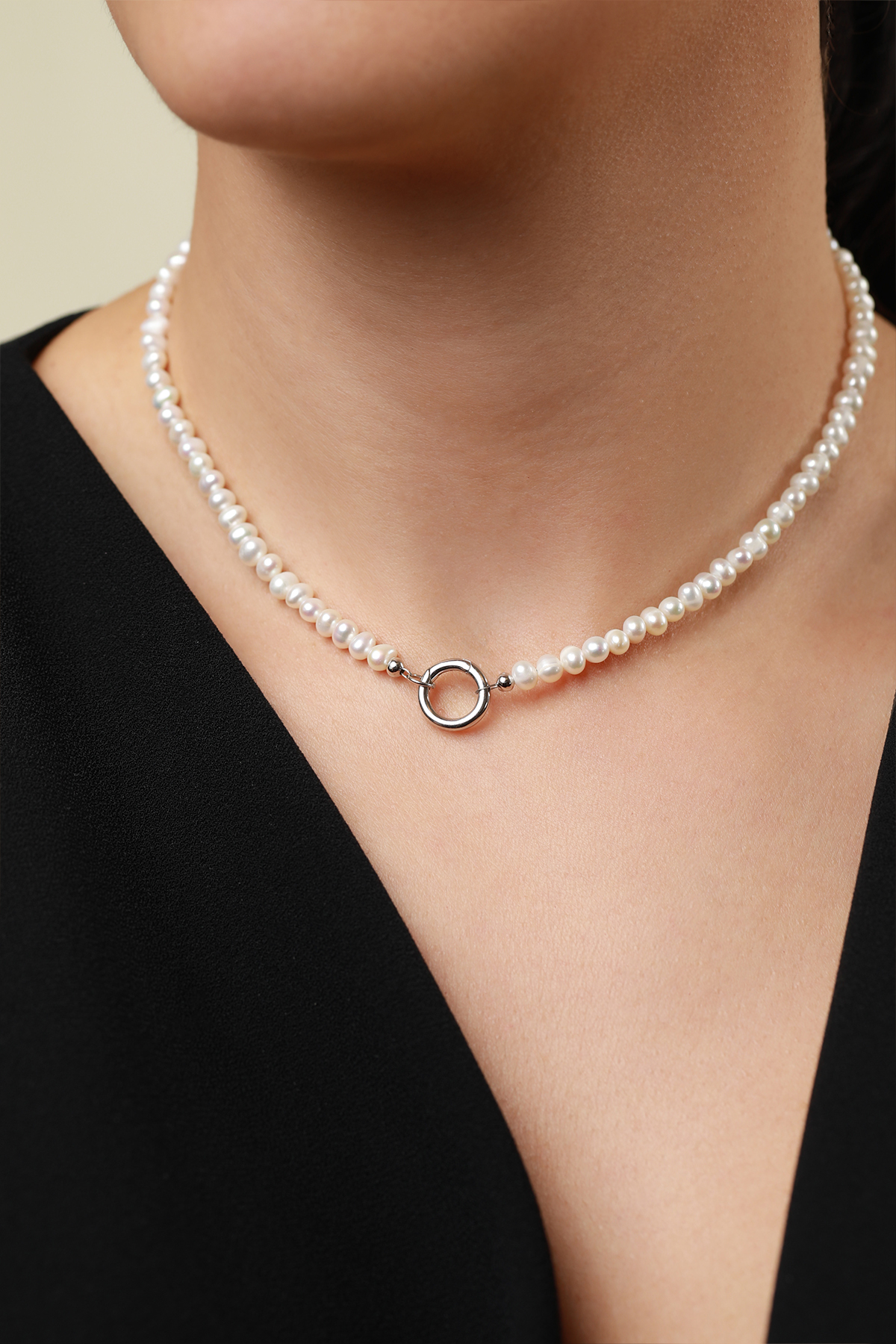 Colier cu perle naturale de cultura Manissi Circle cu inchizatoare din argint 925 placata cu rodiu, placare standard de 0.6 microni. Perlele sunt naturale de cultura, de aproximativ 5 mm, cu forme neregulate ovale, perlele nu sunt rotunde. Colierul are 38 cm cu inchizatoare. Nu poate fi ajustat si nici nu putem aduce modificari asupra lui.