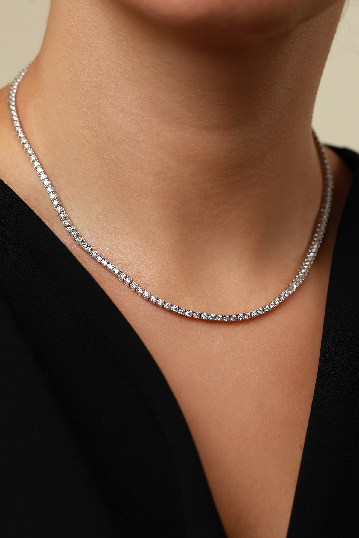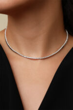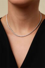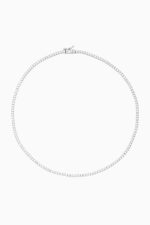 Colier din argint cu pietre moissanite Manissi Tennis 2 mm placat cu aur alb de 18K. Colierul are lungimea de 38 cm sau de 41 cm.