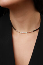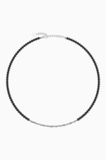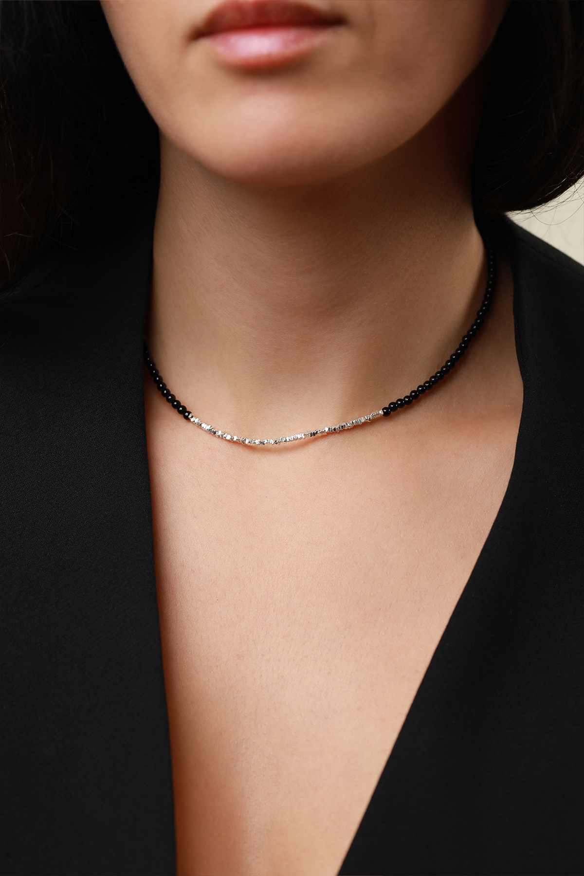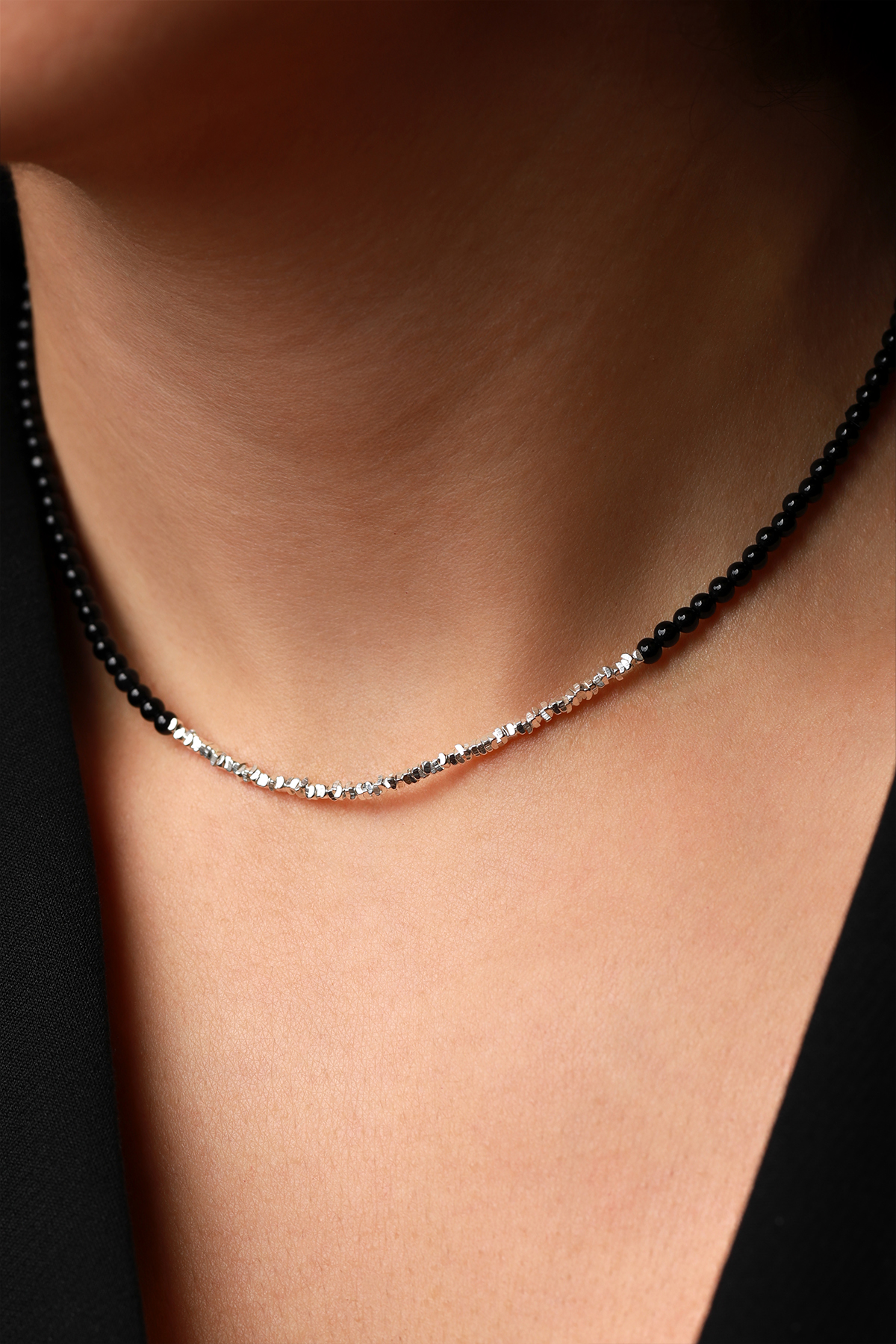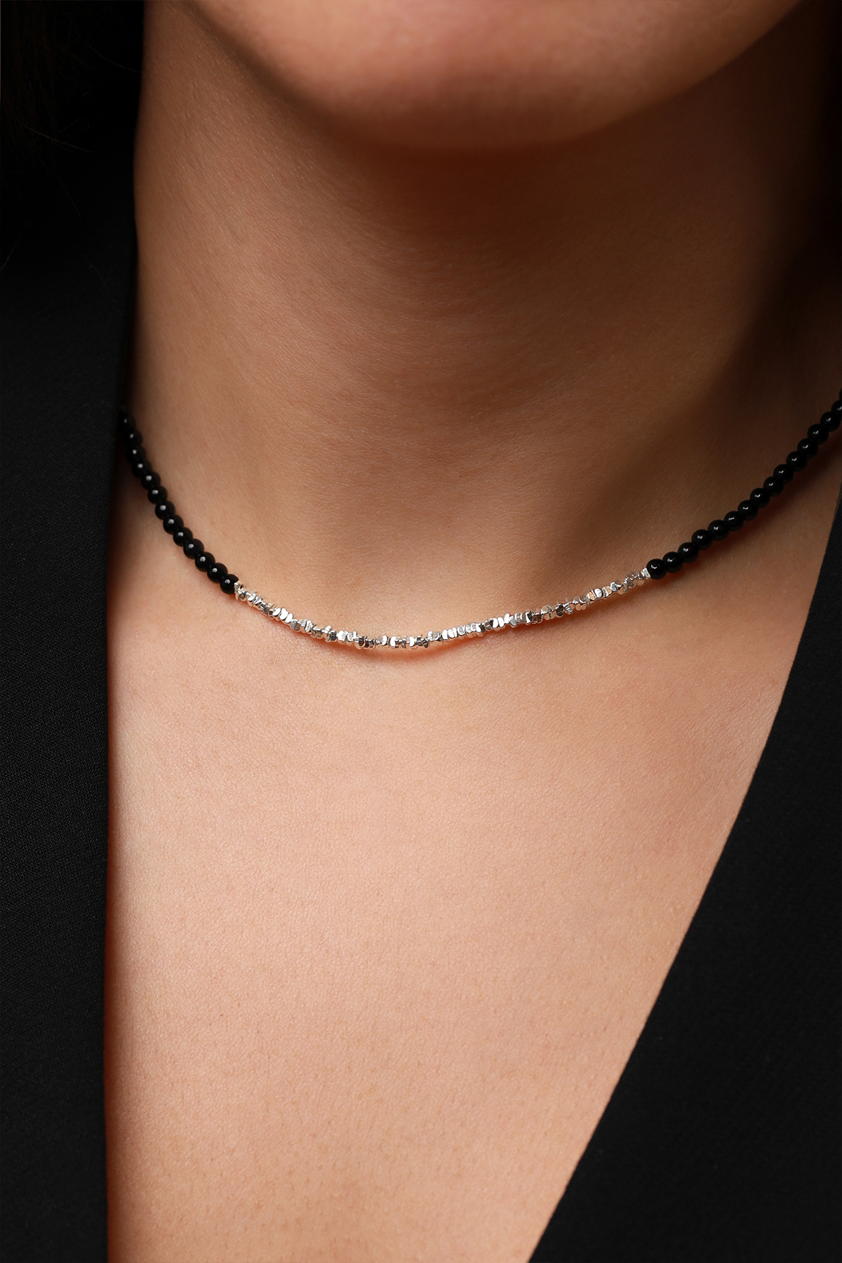 Colier din argint Manissi Black Beads Geometric cu bilute negre sintetice iar in parte din fata forme geometrice din argint 925. Bilutele negre sunt de 3 mm iar inchizatoarea este lobster.