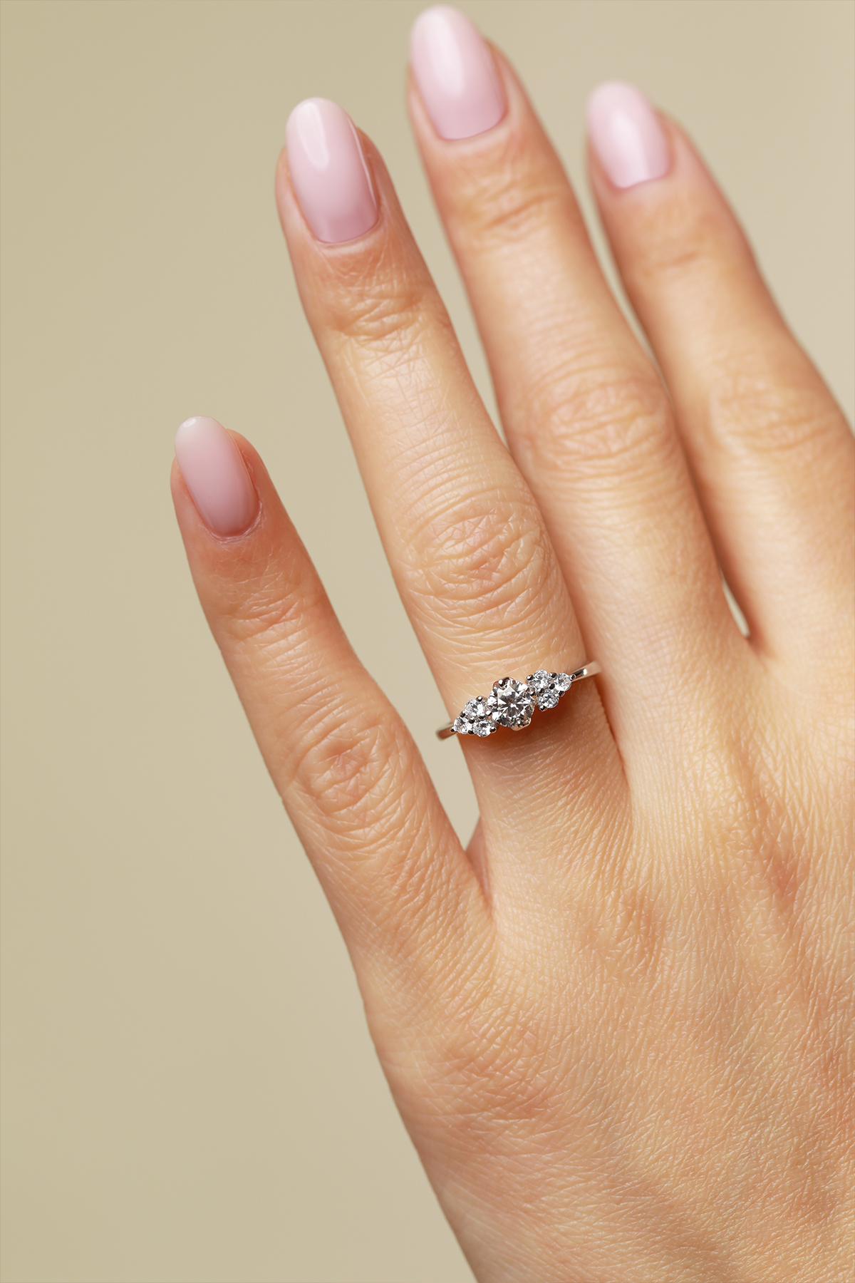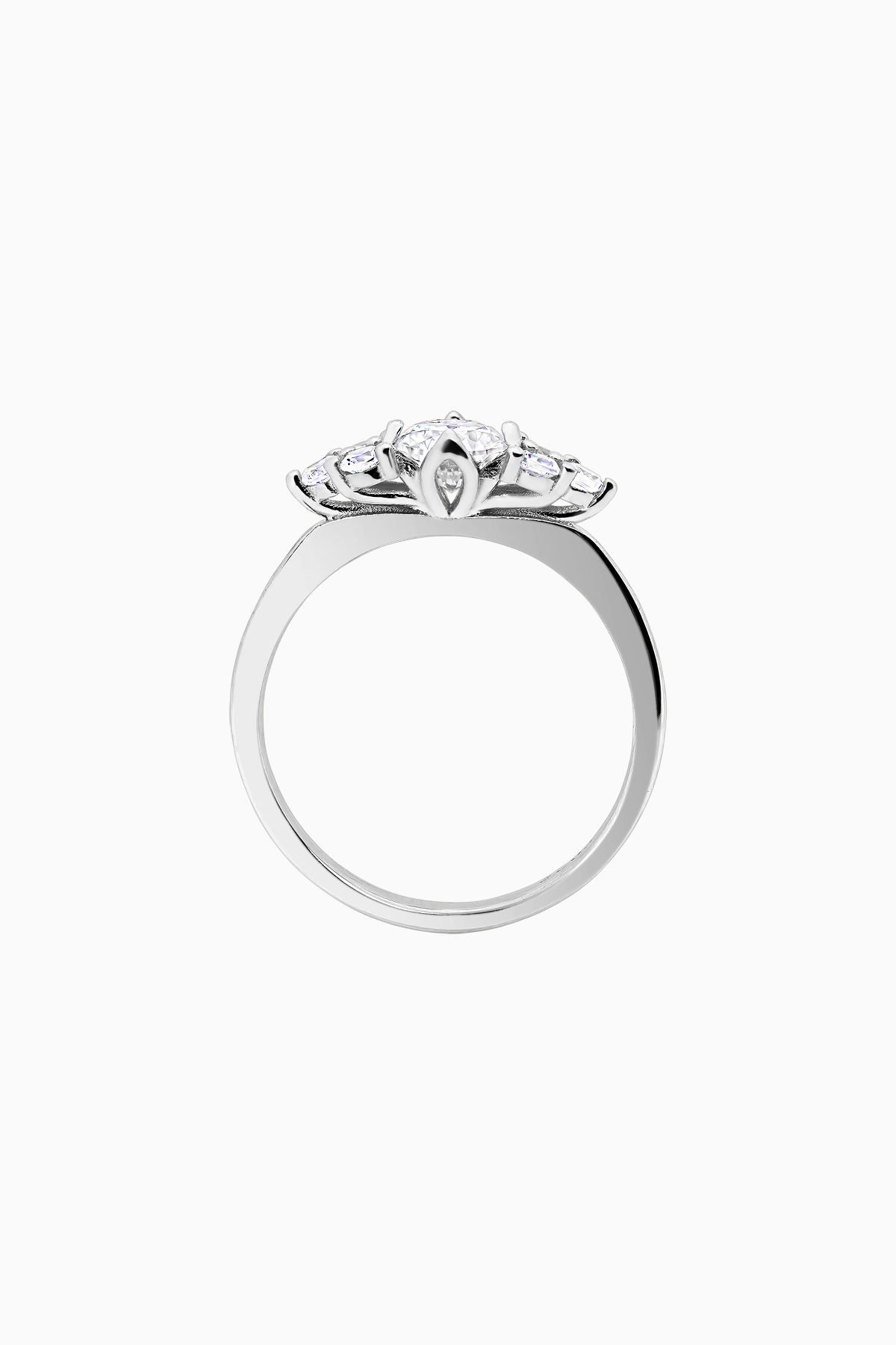 Piatra este Moissanite de 5 mm, 0.5 carate, culoare D, claritate VVS1, taietura excelenta. Cele 6 pietricele dintr-o parte si din cealalta a pietrei centrale au dimensiunea de 2 mm.