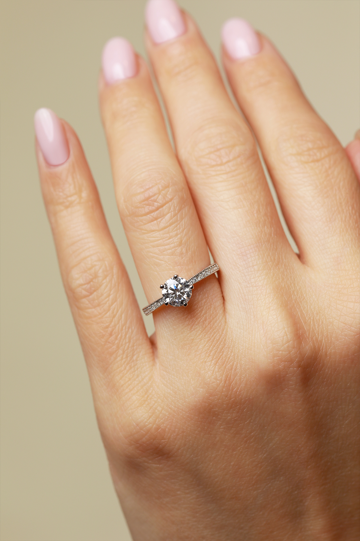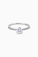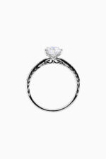 Piatra este Moissanite de 6 mm, 1.0 carat, culoare D, claritate VVS1, taietura excelenta.