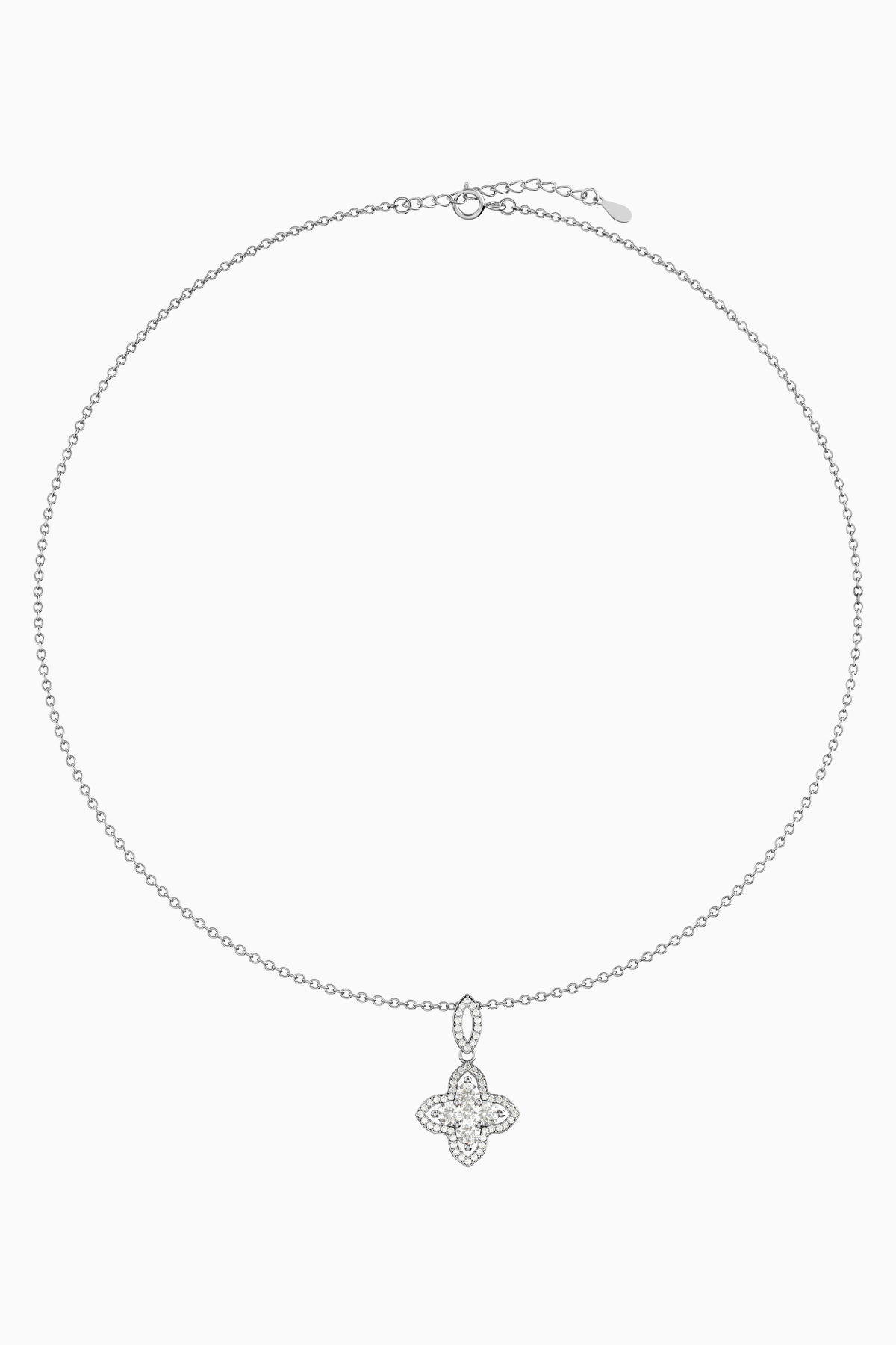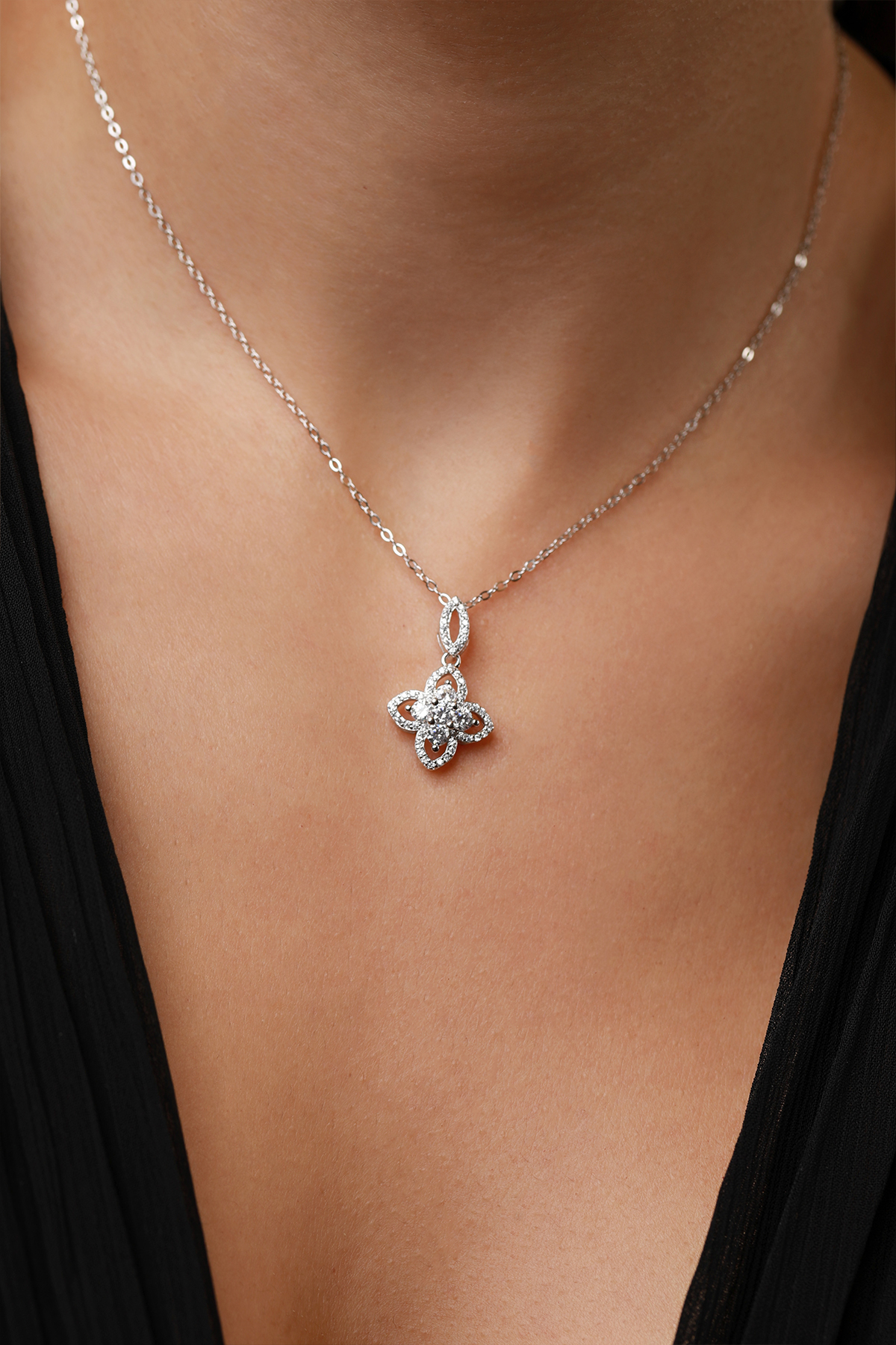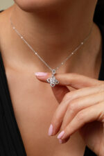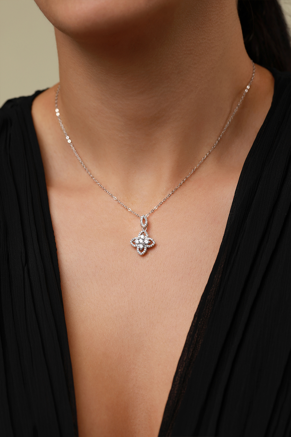 Lant din argint Manissi Crystal Clover placat cu rodiu, placare standard de 0,6 microni. Lant simplu cu pandantiv 2.5 cm cu pietre zirconia. Lantul are lungimea de 40 de cm plus prelungire de 4 cm.