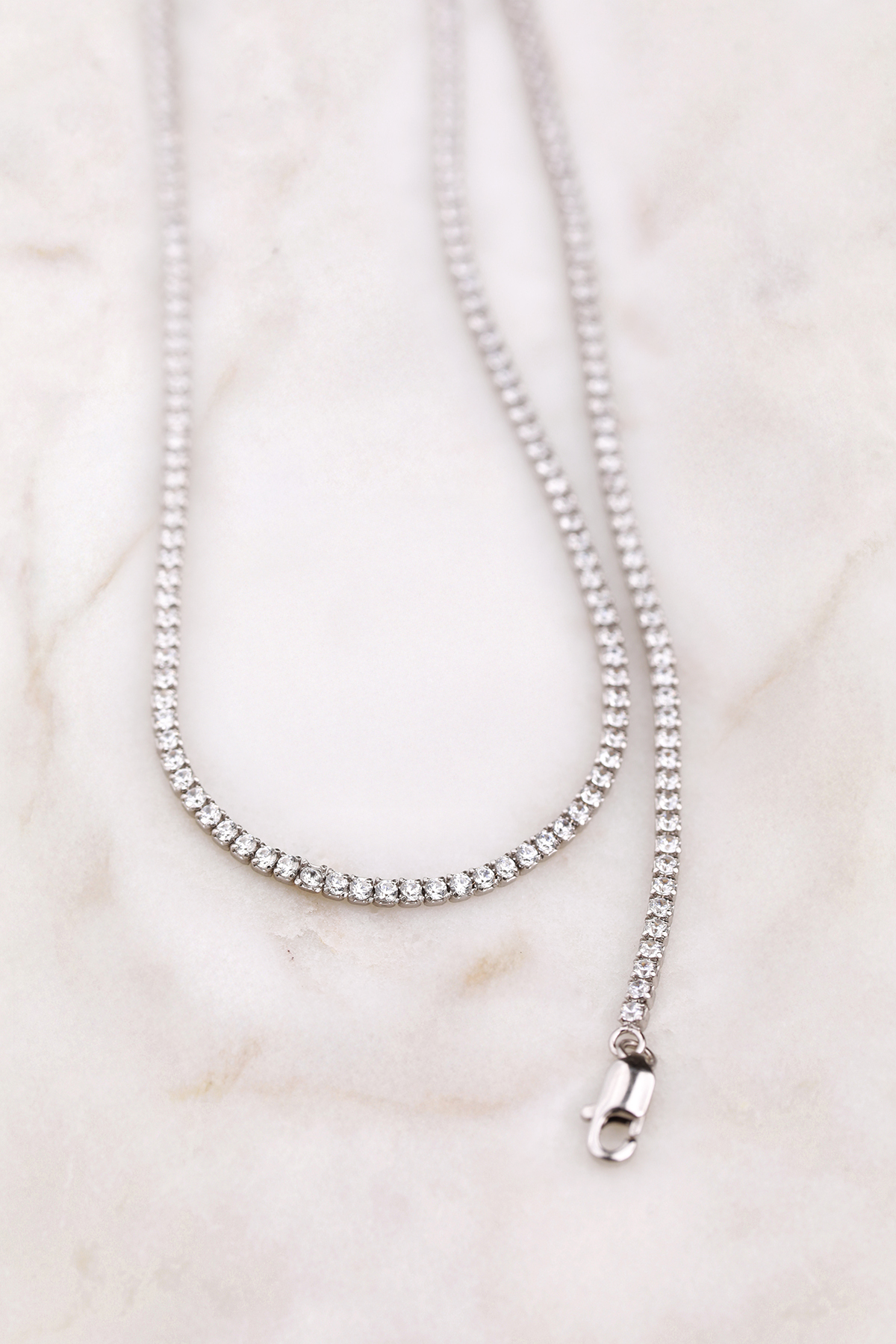 Lant din argint tennis Manissi Precious 1,5 mm placat cu rodiu. Lantul este model choker, la baza gatului, avand lungimea de 31.5 cm cu prelungire de 6.5 cm si grosimea de 1,5 mm . Lantul este prevazut cu pietre zirconia calitatea AAAAA.