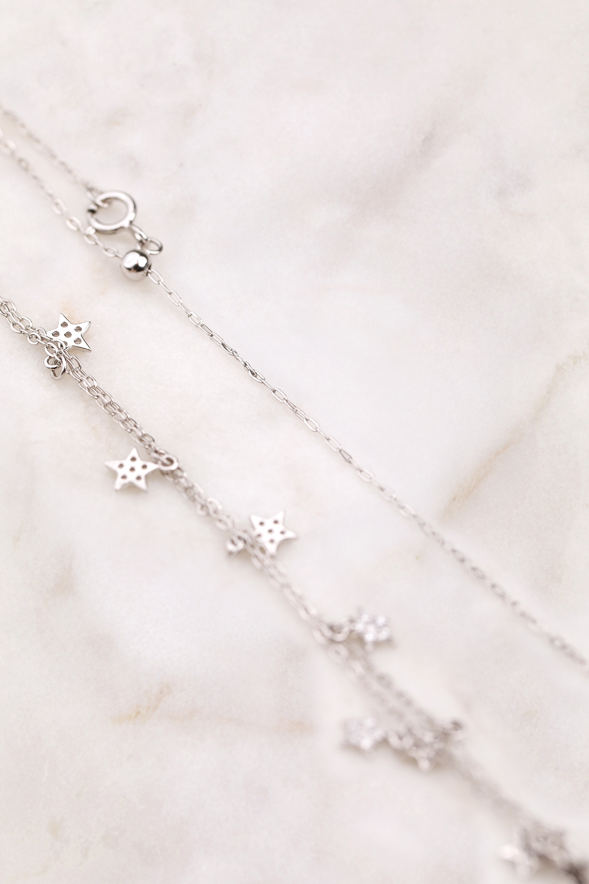 Lant din argint Manissi Zirconia Stars placat cu aur alb de 18k, placare standard de 0.6 microni. Lantul are lungimea de41.5 cm cu posibilitatea de ajustare cu ajutorul unei bilute mobile. Pandantivele stea au dimensiunea de 4 mm. Lantul este model choker, iar pandativele au pietre de zirconiu incastrate.