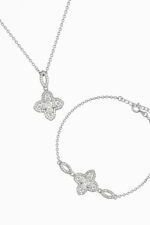 Set compus din lant si bratara din argint Manissi Crystal Clover. Bratara are pandantivul principal de 1.4 cm si este prevazut cu pietre zirconia, placata cu rodiu iar lantul este simplu cu pandantiv 2.5 cm cu pietre zirconia. Lantul are lungimea de 40 de cm plus prelungire de 4 cm.